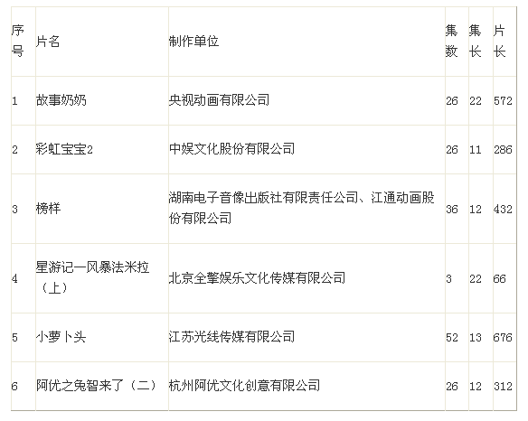 各省、自治区、直辖市新闻出版广电局,新疆生产建设兵团新闻出版广电局,中央电视台,中国教育电视台: 为促进国产电视动画片精品创作生产,充分发挥优秀国产电视动画片的示范带动作用,经省级广播电视行政部门、中央电视台初选,国家新闻出版广电总局邀请相关播出机构、专家和观众代表进行审看终选,确定《故事奶奶》《彩虹宝宝2》等6部国产动画片为2017年第一季度推荐播出优秀片目。这些作品坚持正确价值导向,具有较高艺术水准和制作水平,请各级广播影视行政管理部门立即向所辖各级电视台传达,全国各级电视台特别是上星综合频道、动画少儿上星频道、地面少儿频道可予以优先安排播出。 特此通知 附件:2017年第一季度优秀国产动画片目录.docx 国家新闻出版广电总局办公厅 2017年9月6日 附件:2017年第一季度优秀国产电视动画片目录