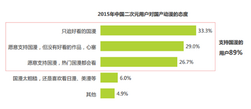 但是国漫在国内受众群里的仇恨值并不高,相反,虽然由于目前体制并不完善、产业链并未成熟的背景下,但是将近有9成的用户对于国漫保持支持的态度。