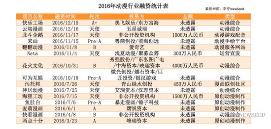 2016动漫行业融资统计